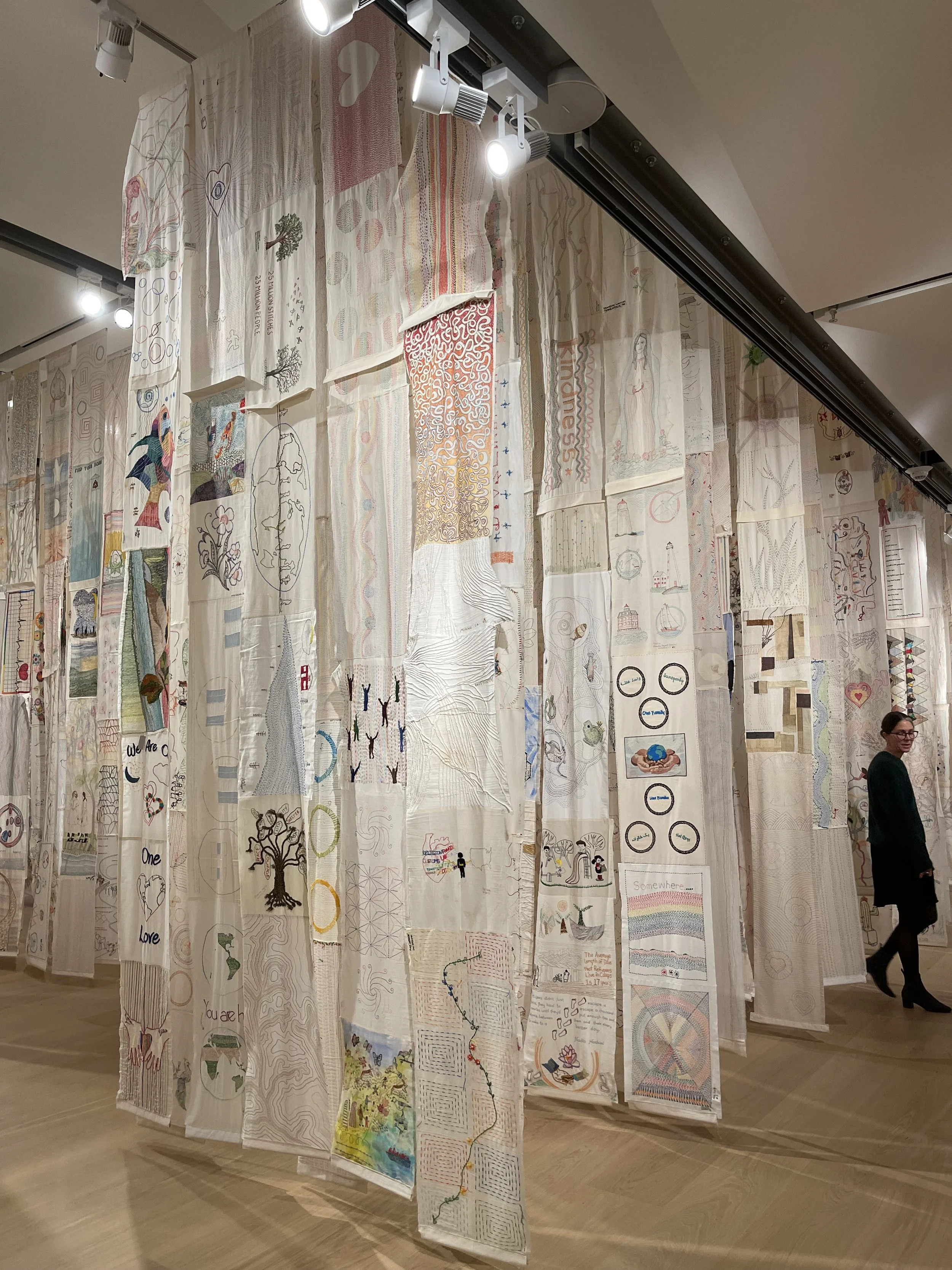 25 Million Stitches: One Stitch, One Refugee is an artistic statement from the international community about human displacement, immigration, and solidarity. It is an aggregation of 25 million hand-sewn stitches, each representing a single displaced human being as counted in the UN’s High Commissioner on Refugees 2019 report. The stitches are bound to 407 muslin banners, each 14’ long. Building this physical representation of this statistic required participation from 2,300 stitches from 37 countries, all 50 U.S. states.